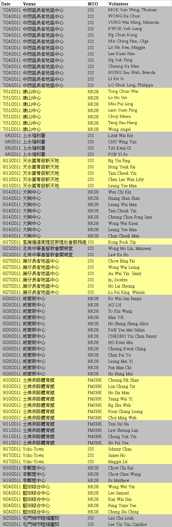 2011年肺功能測試活動 “給我一口氣”經已順利完成。香港胸肺學會/香港胸肺基金會/美國胸肺學院(港澳分會) 在此感謝超過80名呼吸科醫生及護士的積極參與﹐於7月24日至9月25日期間﹐在港九新界各區舉辦了15次肺功能測試活動﹐接受評估的高風險市民超過1000名。所得數據將會於分析後公佈。以下為活動的圖片及出席活動的醫護人員名單﹕