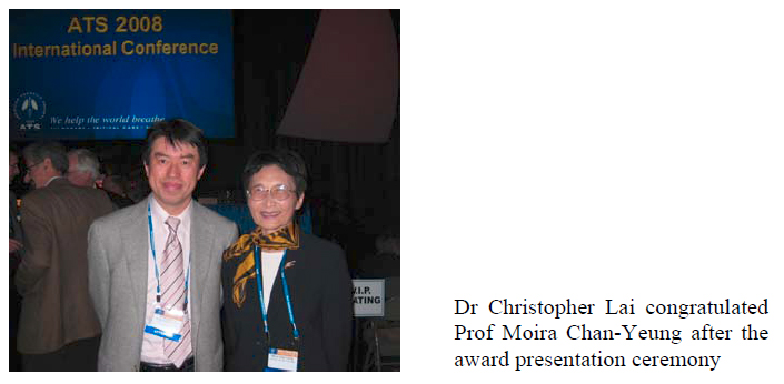 Professor Moira Chan-Yeung, currently the Honorary Professor of Medicine of the University of Hong Kong and Emeritus Professor of Medicine of the University of British Columbia, has been presented the Distinguished Achievement Award 2008 by the American Thoracic Society during their annual international conference held in Toronto in May 2008. The American Thoracic Society Distinguished Achievement Award is given to individuals who have made outstanding contributions to fighting respiratory disease through research, education, patient care or advocacy, and only up to two awards may be given each year.