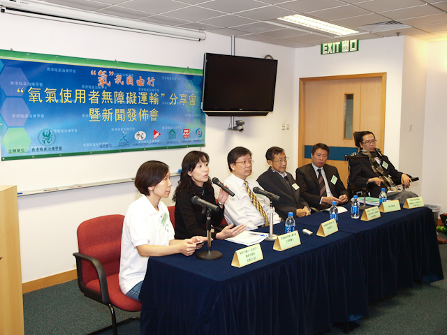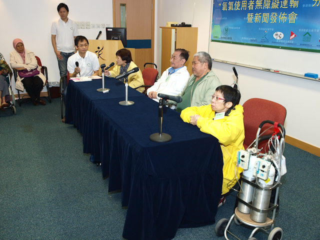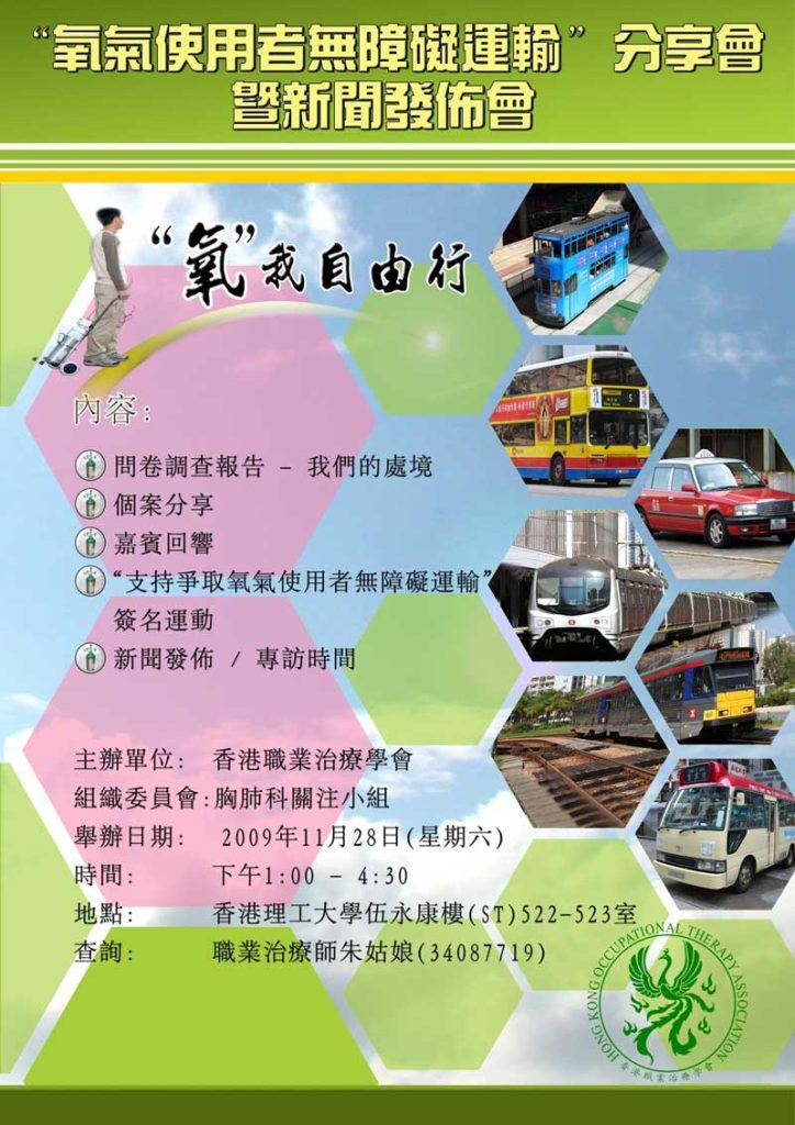 This function “Sharing Session Cum Press Conference of Access to Public Transport for Oxygen Users” was organized by the Hong Kong Occupational Therapy Association on 28 Nov 2009. Its aim was to promote patient’s rights to use oxygen therapy in public transport.