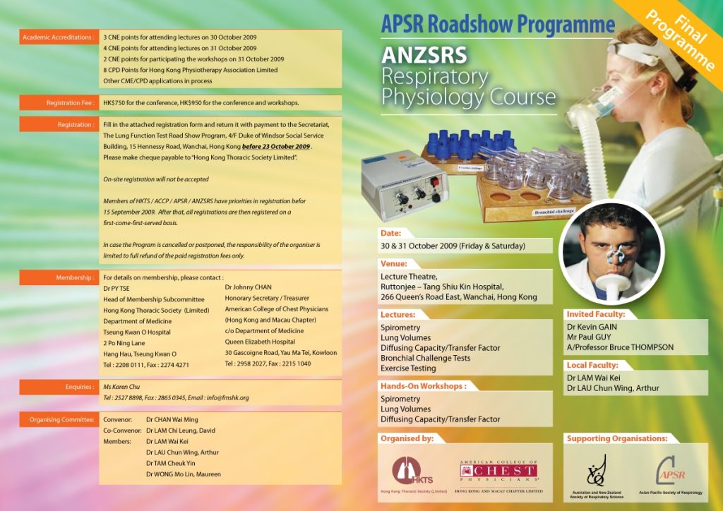 The ANZSRS Lung Function Test Roadshow Program is a training course on various aspects of lung function testing in form of both lectures and hands-on workshops. Members of HKTS/ACCP/APSR/ANZSRS have priorities in registration. Non-members are then registered on a first-come-first-served basis.