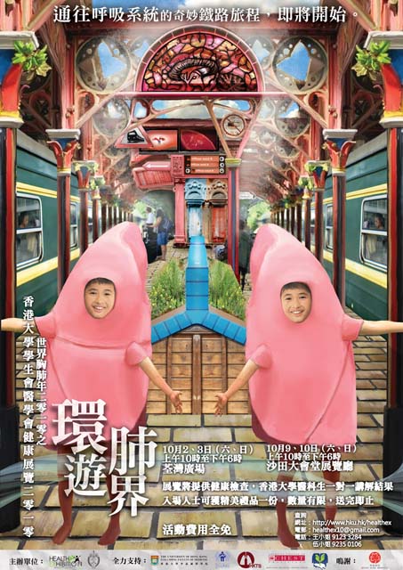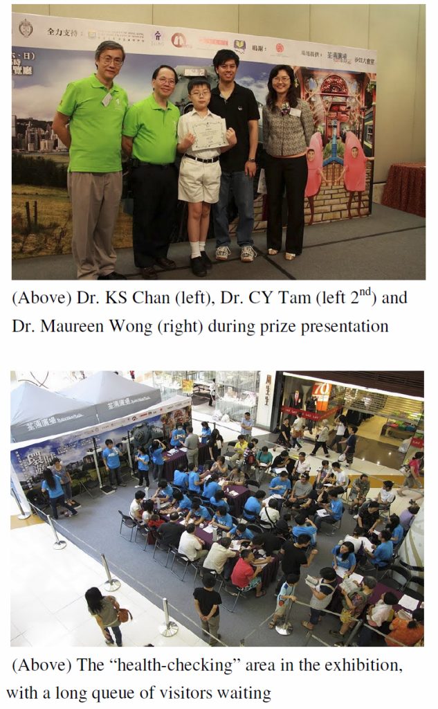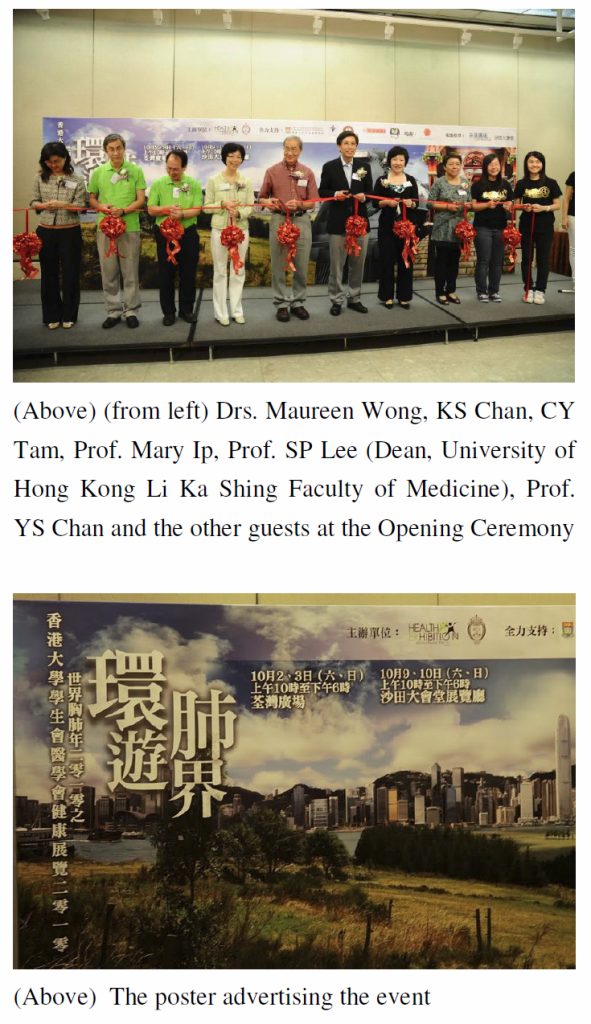 The annual HKU Health Exhibition was hosted by the Hong Kong University Medical Society and Nursing Society Health Exhibition Subcommittee, with full support from HKLF, HKTS and ACCP (HK & Macau Chapter) this year. The 4-day exhibition was held from Oct 2 – 3, 2010 in Tsuen Wan Plaza and Oct 9 – 10, 2010 in Shatin Town Hall. The Exhibition provided the public with updated information on respiratory health and diseases including pulmonary physiology, pulmonary infections, asthma, COPD, lung cancer, etc. General health checks including blood pressure measurement and portable spirometry were offered to visitors and the counselling offered by medical and nursing students was well received by the public. The estimated number of visitors was 2000 over the four days.