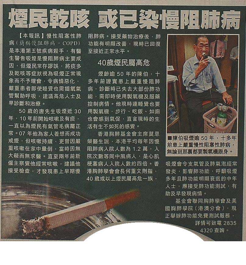 The Hong Kong Lung foundation (HKLF), the Hong Kong Thoracic Society (HKTS) and the American College of Chest Physicians (Hong Kong & Macau Chapter) have launched a series of events to celebrate the 15th and 25th anniversaries of HKLF and HKTS respectively as well as to promote public awareness on chronic obstructive airway disease (COPD). As at 19th August 2011, in collaboration with organizations such as St. James Settlement and HK Society for Rehabilitation / Community Rehabilitation Network, the Respiratory Societies had conducted a number of sessions and offered spirometric assessments in high-risk individuals in the community, such as those aged above 40 and with a current or past smoking history. To escalate public awareness in COPD and to encourage the participation of such events, numerous educational talks and interviews had been made and were covered in various media including radio programs, TV shows, internet news and newspapers in June and July 2011. On 17th August 2011, a press conference was conducted by the 3 Respiratory Societies to alert the public on the importance and burden of COPD in Hong Kong and the whole world, as well as the ongoing Spirometric Campaign and the other related activities. The press conference had attracted huge media interest and was extensively covered in various media afterwards. Through the series of events and the efforts of the local Respiratory Societies, the importance of recognition of early symptoms of COPD in high-risk individuals, and the subsequent diagnosis by spirometry as well as smoking cessation can hopefully be promulgated to our Hong Kong population.