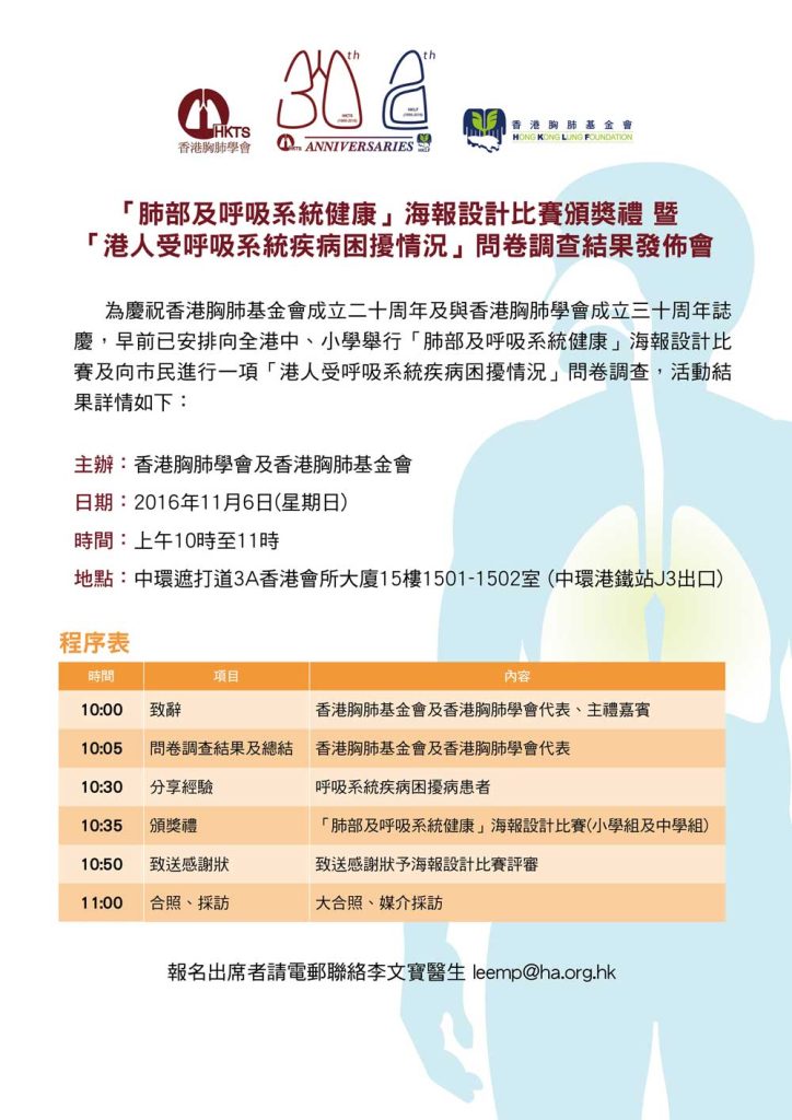 適逢今年是香港胸肺基金會成立二十周年及與香港胸肺學會成立三十周年,兩會委託香港健康網絡於今年4至6月內進行問卷調查,成功完成509份問卷,並於十一月六日舉行記者會公佈結果。調查顯示,受訪者均曾患有呼吸系統疾病包括:哮喘、氣管敏感、慢性阻塞性肺病、肺炎、肺结核、流感或上呼吸道感染、支氣管擴張、阻礙性睡眠窒息病、氣胸等等,當中以氣管敏感最多,佔37.7%,其次是流感或上呼吸道感染有28.3%,哮喘則有15.7%。