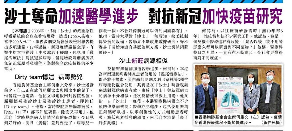 92023/03/05Takungpao A0920年前打贏沙士 帶着經驗再戰新冠 抗疫壯士:樂見疫苗加速研發