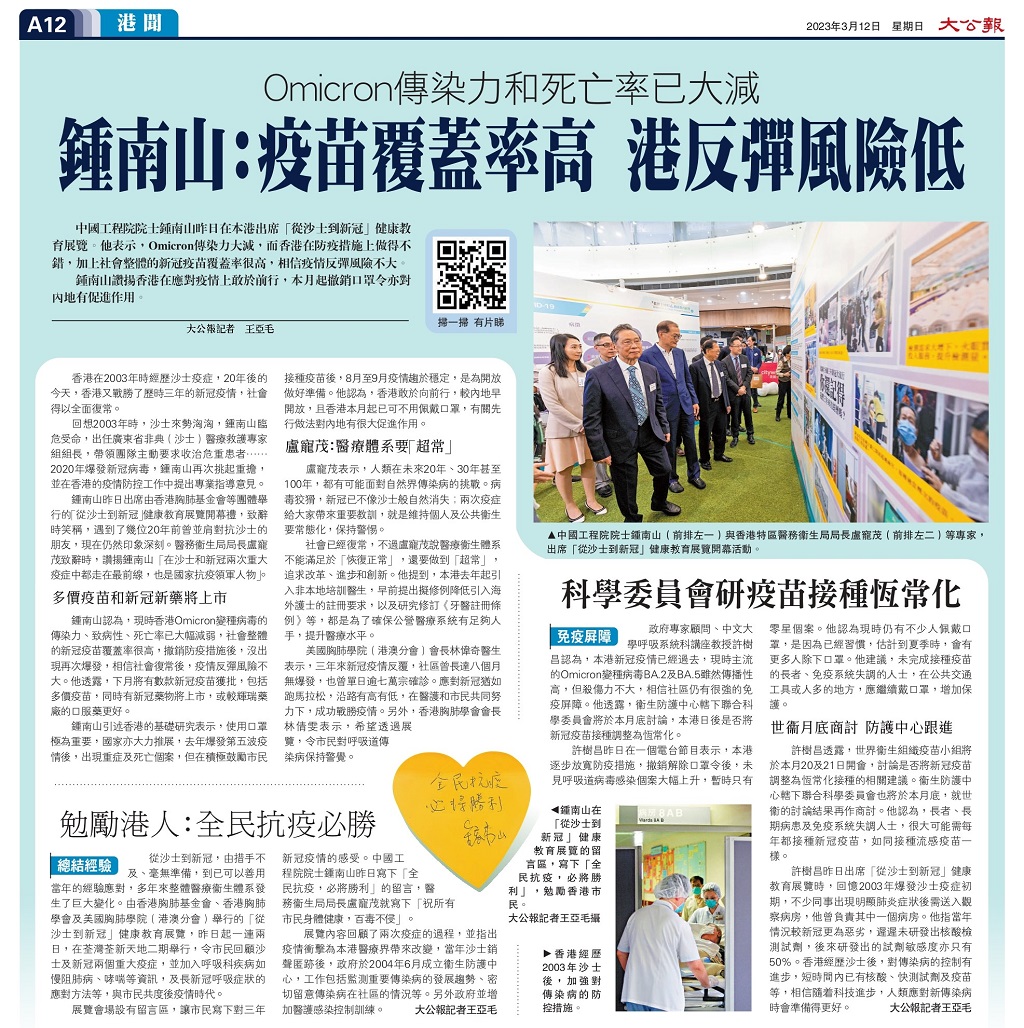 632023/03/12Takungpao A12Omicron傳染力和死亡率已大減 鍾南山:疫苗覆蓋率高 港反彈風險低