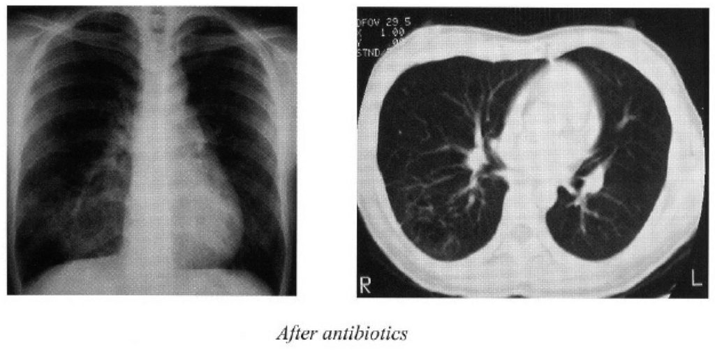 The following investigation was all negative including: serum Aspergillus Ab, Serology of Influenza, adenovirus, Parainfluenza, mycoplasma, chlamydia, respiratory syncytial, enterovirus, cold agglutinins and blood culture.