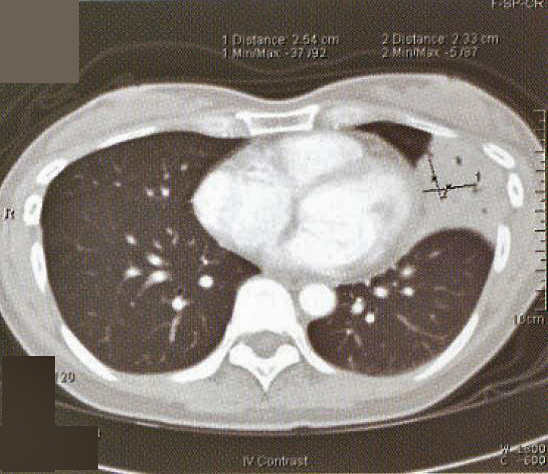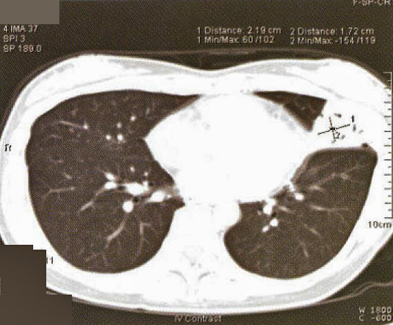 A 41-year old secretary was found having a left mid zone opacity on a routine CXR taken as part of her annual medical check-up (fig. la). This radiographic abnormality persisted after she was given a course of Azithromycin by her family physician (fig. 1b). She was a lifelong non-smoker with a past history of hyperthyroidism treated with drugs for 18 months in 1985-86 and had been euthyroid since. Two months prior to her medical check-up, she had a flu-like illness with cough and a sore throat that lasted for about a fortnight. She had been asymptomatic since apart from a slight cough occasionally. She denied any fever, weight loss, night sweat or pruritus. There was no history of taking any long-term medication or exposure to chemicals or animal pets. Clinical examination was normal and in particular, she was afebrile and not in respiratory distress. SaO2was 98% at rest whilst she was breathing room air and spirometry was normal.