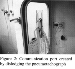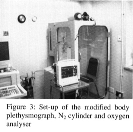 A communication port was created by dislodging the pneumotachograph from the body plethysmograph (Figures 1 & 2). Tubings for nitrogen infusion, sensor of the oxygen analyzer and oxygen nasal prongs & tubing were placed inside the body plethysmograph through this communication port (Figure 2). A size G cylinder containing 1,250 litres of 99.995% nitrogen at 135 Bar was used to deliver nitrogen into the body plethysmograph through two flow-meters, each at the initial rate of 15 litres per minute. The oxygen analyzer used in this test was a fuel cell electrochemical analyzer. Figure 3 showed the complete set-up for this hypoxic challenge test.