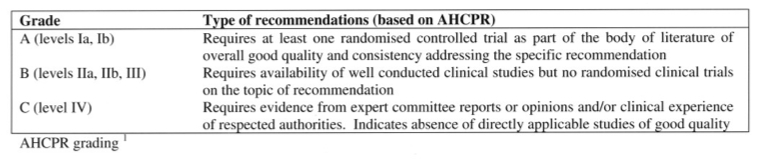 The level of evidence of the BTS Recommendations is at the best Grade B with the AHCPR Scale. The Recommendations are based on consensus opinions and data derived from a few randomised control trials that involved small number of study subjects.