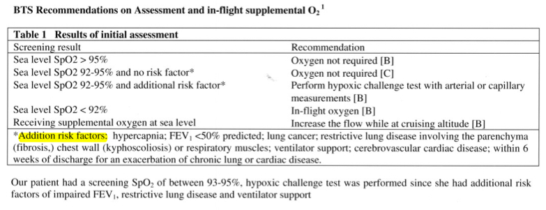 In accordance with the BTS Recommendations on assessment 1,2a hypoxic challenge test was subsequently performed because this patient had, besides a screening Sp02 value of between 93-95%, the following additional risk factors: (i) FEVl <50% predicted, (ii) restrictive lung disease due to severe kyphoscoliosis and old poliomyelitis, and (iii) being on ventilatory support.