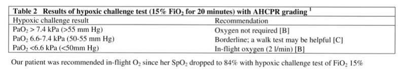 Based on the results of this hypoxic challenge test, the followings were recommended to our patient for air travel: