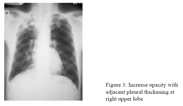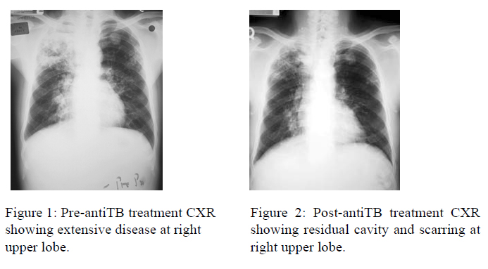 He had history of diabetes mellitus and hypertension for 5 years. He was treated with metformin 1g BD, gliclazide 160mg BD and lisinopril 7.5mg QD. Both conditions were well-controlled. He had history of pulmonary tuberculosis in 2004 which was sputum culture positive with favourable drug susceptibility pattern. The main bulk of disease was at the right upper lobe. He was treated with 9 months of anti-TB treatment with good response except residual cavity and scarring at the right upper lobe (fig 1 and 2)