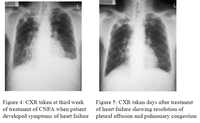 In conclusion, antifungal drugs remain the mainstay of treatment of CNPA and experience with high dose itraconazole treatment has been accumulated over years. It is not surprising to encounter some of the side effects that have not been emphasized previously. There may be a number of strategies in dealing with heart failure or other cardiovascular problems complicating itraconazole therapy. The diagnosis of CNPA and the response to treatment should be reviewed. Treatment cessation can be considered in those with high risk-benefit ratio. If continuation of treatment is more advisable, changing to alternative anti-fungal agent or reducing the dosage of itraconazole should be considered.