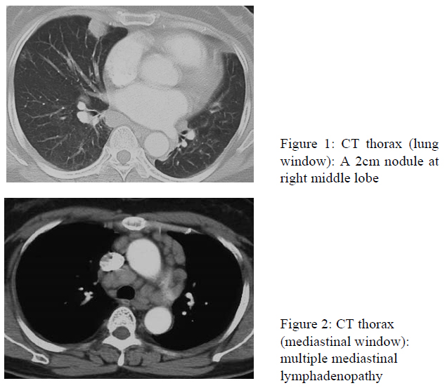 Her renal function was impaired with creatinine 190 mmol/l and urea 11 umol/l. Adjusted calcium level was 3.04 mmol/l. 24-hour urine for calcium was elevated. Parathyroid hormone was suppressed. Endobronchial ultrasound (EBUS) with transbronchial needle aspiration (TBNA) of the mediastinal lymph nodes yielded non-caseating granulomatous inflammation. The differential diagnoses included tuberculosis, malignancy with lymph node metastases and sarcoidosis. A conventional bronchoscopy with transbronchial biopsy targeted at the lung nodule showed non-specific changes. Bronchoalveolar lavage at right middle lobe was negative for fungal culture, polymerace chain reaction for tuberculosis and acid fast bacilli (AFB) culture. Fine needle aspiration of the lung nodule under CT guidance yielded atypical cells. She then proceeded to open biopsy of right middle lobe nodule and mediatinal lymph node sampling via video-assisted thoracosopic surgery. The histology revealed non-caseating granuloma and stains for AFB and fungus were negative. The ultimate diagnosis was sarcoidosis. She was treated with prednisolone with good response.