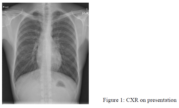 Physical examinations were mostly unremarkable. The blood pressure was normal. Initial blood tests showed Hb 19.5g/dL, Hct 0.56L/L, white blood cell 5.5 x10^9/L, platelet 211 x10^9/L with normal liver and renal function tests. His CXR on presentation was shown in Fig. 1.