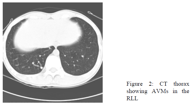 CT thorax was performed subsequently. Four arteriovenous malformations (AVMs) ranged from 0.6cm to 1.5cm were detected in right lower lobe (Fig.2). They all received single artery supply from branches of right lower lobe pulmonary artery and drained to a single vein towards right inferior pulmonary veins. This patient had no telangiectasia over face, chest and upper extremities. There was no mucosal telangiectasia. He had no epistaxis or history of gastrointestinal bleeding. He had no family history of hereditary haemorrhagic telangiectasia (HHT).