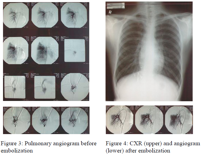 Shunt fraction measurement is commonly measured by the 100% oxygen method. Radionuclide perfusion lung scanning is another method for shunt fraction measurement. However, it is expensive and not routinely available in many centers5. Contrast-enhanced echocardiography is useful to look for any intra-cardiac or intra-pulmonary shunt. Computerized tomography of the chest evaluates PAVM vascular anatomy and is very sensitive for PAVM detection8. Pulmonary angiography is the gold standard in the diagnosis of PAVM. It is used to define the angioarchitecture and is necessary if resectional or obliterative therapy is being considered 9.