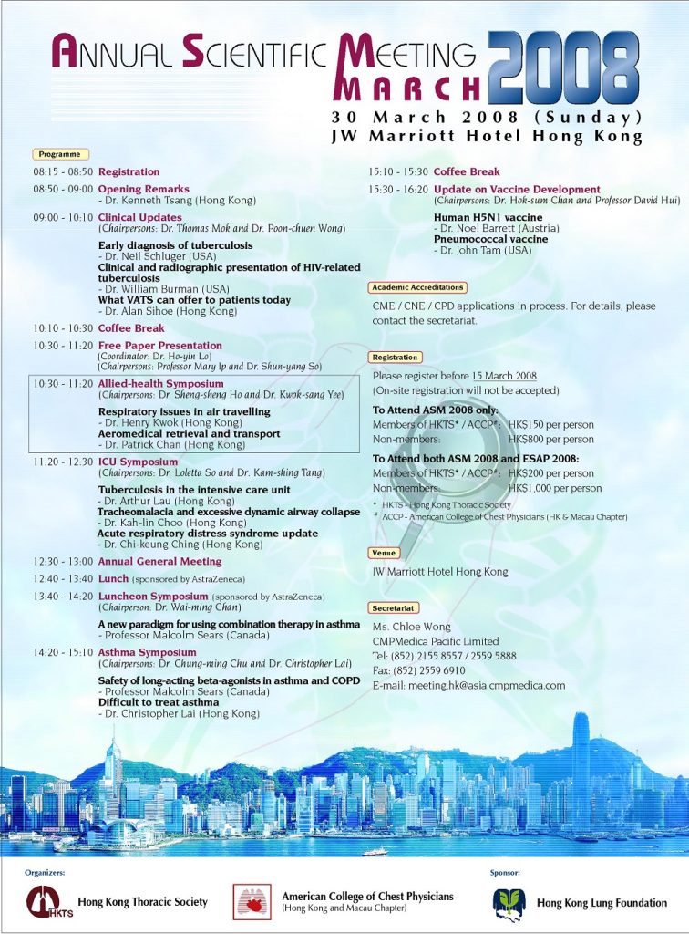 With the support from the Hong Kong Lung Foundation, the Hong Kong Thoracic Society and the American College of Chest Physicians (Hong Kong and Macau Chapter) jointly organized the Annual Scientific Meeting (ASM), which was successfully held in March this year at the Marriot Hotel of Hong Kong.