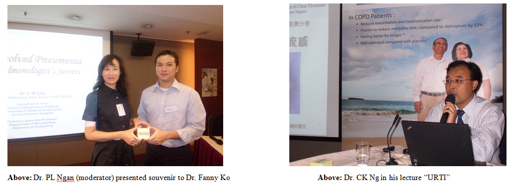 This course has been co-organized by Hong Kong Thoracic Society and Hong Kong College of Family Physicians. The theme in 2009 was “Respiratory Infections” and the series of lectures were held from the end of September to October. Under the leadership of Dr. PY Tse, a distinguished panel of speakers had been invited that included Dr. HS Chan, Dr. WC Yu, Dr. CM Tam, Dr. MP Lee, Dr. YC Yeung, Dr. CK Ng, Dr. CM Chu and Dr. Fanny Ko. With the comprehensive topics that included community-acquired pneumonia, antibiotic resistance, tuberculosis, infections of the immunocompromised, atypical pneumonias, upper respiratory tract infection (URTI), unresolved pneumonia and role of respiratory infections in airway diseases, the event was certainly a success with encouraging response.
