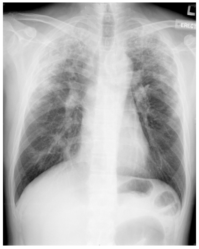 His chest x-ray (CXR) showed bilateral upper lobe infiltrates with peripheral predominance (figure 1). Erythrocyte sedimentary rate (ESR) was elevated at 120mm/hr. Leukocytosis was noted with total white cell count at 18.0×10^9/L. Reversed A/G ratio was noted (albumin 30g/L, globulin 56g/L). Although two sputum samples for acid-fast bacilli (AFB) smear were negative, he was empirically treated as pulmonary tuberculosis (TB) with isoniazid, rifampicin, pyrazinamide and ethambutol with the clinical presentation and was subsequently referred to the chest clinic for subsequent management.