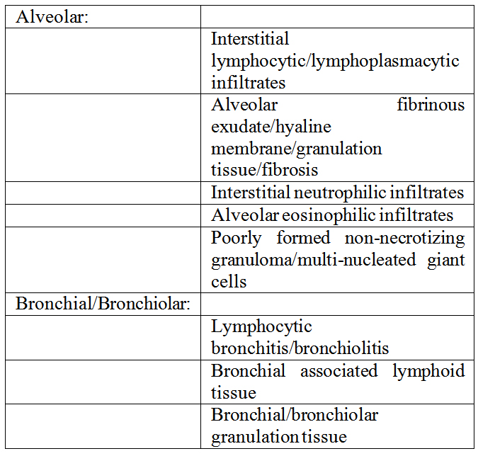 CXR findings are non-specific. There would be interstitial infiltrates, consolidations or pleural effusions. It may be localized to either the upper or lower lungs. Computed tomography can confirm the CXR findings and to exclude mediastinal or pleural pathologies. It can also localize the area for tissue sampling. Histology may show abnormalities in alveoli, bronchi or bronchioles.[1] (Table1) Treatment can be simple. Withholding the drug usually results in rapid improvement. Steroid may be used. Prognosis is good in general.