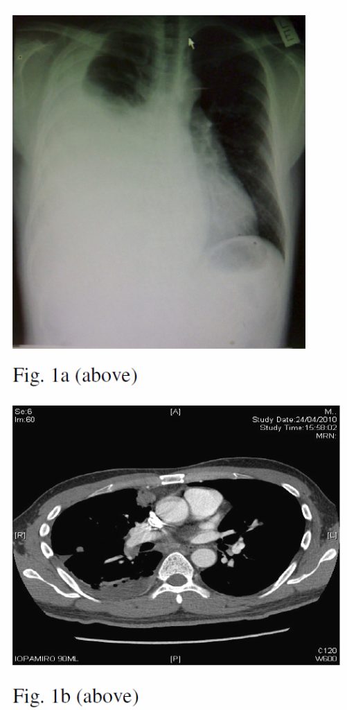 The patient was a 36 year-old non-smoker with no family history of lung cancer, complained of insidious onset of breathlessness and dry cough for weeks. Physical examination showed right pleural effusion. His CT thorax showed an enhanced soft tissue lesion (2.2cm x 1.9cm) at the anterior segment of right upper lobe (Fig. 1a & 1b). There were also another 0.5cm enhancing soft tissue nodule at the lateral segment of right middle lobe, pre-tracheal lymphadenopathy and collapse consolidation of basal segment of right lower lobe. Sputum was not available for investigation. Diagnostic thoracocentesis yielded heavily blood-stained pleural fluid. Closed pleural biopsy was negative but the pleural fluid cytology showed metastatic adenocarcinoma. The final diagnosis was advanced bronchogenic adenocarcinoma.