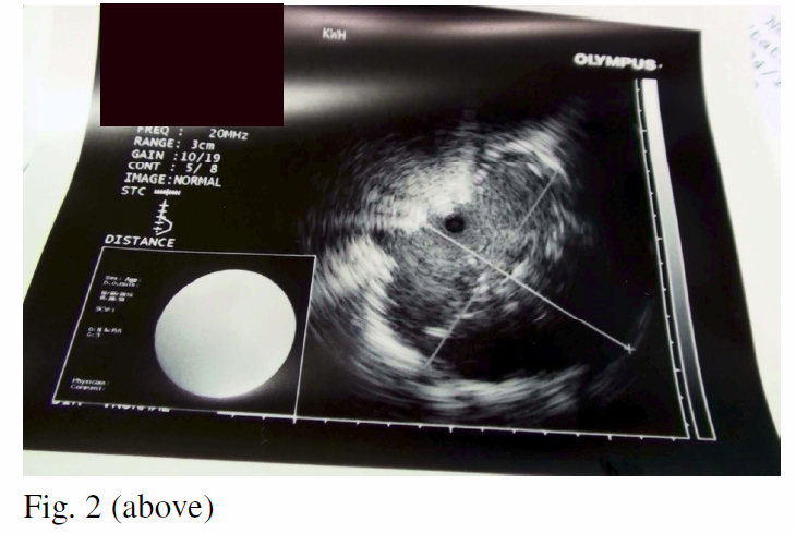 EBUS guided transbronchial lung biopsy. With the guidance of radial EBUS probe through the working channel of a regular therapeutic bronchoscope, a lesion measured 1.67cm x 1.89cm (Fig. 2) was located distal to the RB3a subsegment. Guidesheath guided brush cytology and transbronchial biopsy yielded adenocarcinoma. Subsequent mutation study showed a 15 bp deletion (2235-2249) of the exon 19, compatible with an exon 19 EGFR activation mutation.