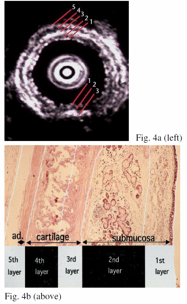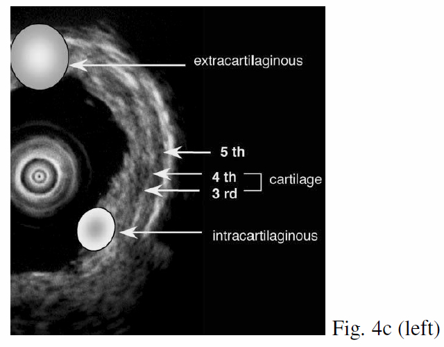 Seven echogenic layers of cartilaginous part and 3 echogenic layers of membranous part of tracheobronchial tree can normally be identified with R-EBUS (Fig 4a & 4b). The 3rd-5th layers denote the cartilage layers by which destruction determine invasion by central airway tumours (Fig 4c). Kurimoto et al. demonstrated that EBUS findings correlated well with histological findings in all 24 but 1 of cases, and the only false positive case was lymphocytic infiltration rather than tumour invasion of adventitia.3 Herth et al. also showed similar results in 56 patients. The false negative lesions were all located at the trachea. The small size of radial probe and the limited contact of balloon with tracheal wall could have been the reasons. EBUS findings were highly correlated with surgical findings (r=0.89, p<0.01), and with accuracy 94%, sensitivity 89%, specificity 100%, which compared favourably with CT (r=0.06, p=0.4), with accuracy 51%, sensitivity 75%, specificity 28% respectively.4