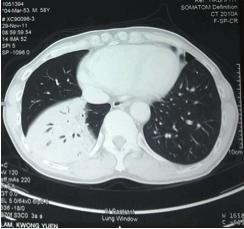 He was afebrile and had no chest symptoms. Blood tests including complete blood count, liver and renal functions were normal. His LDH level and Albumin/globulin level were normal. Sputum culture and AFB smear were negative. He was given Augmentin for one week empirically; and he performed private CT thorax with contrast in the same month.