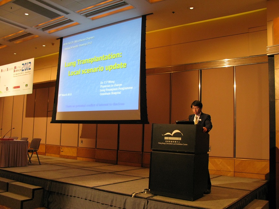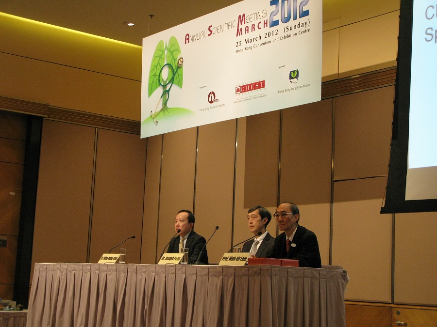 The Annual Scientific Meeting 2012 was held on 25th March, 2012 at the Hong Kong Convention and Exhibition Center. The program started with a Clinical Update Symposium with Obesity Hypoventilation Syndrome, Palliative Care for end stage respiratory diseases and venous thromboembolism, followed by two concurrent symposia, one on Lung Transplant and an allied health symposium on occupational-related respiratory diseases and occupational asthma. The mid-day program was an Advances in Therapeutic Symposium focused on Therapeutics for COPD. In the afternoon, there were two symposia, the first one was a General Respiratory Symposium on obstructive sleep apnea and latent tuberculosis infection, and the whole Seminar was concluded with a Private Specialist Symposium.