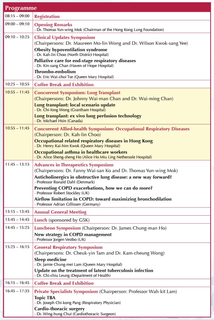 Date: 25th March 2012; Venue: Hong Kong Convention and Exhibition Centre; Organisers: Hong Kong Thoracic Society and American College of Chest Physicians (HK and Macau Chapter); Sponsor: Hong Kong Lung Foundation