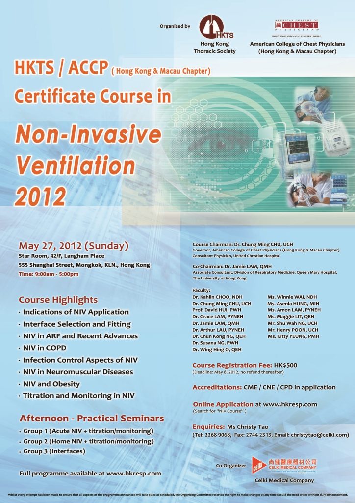 You are cordially invited to attend the “Certificate Course in Non-Invasive Ventilation 2012”, co-organized by the Hong Kong Thoracic Society and the American College of Chest Physicians (Hong Kong & Macau Chapter), on 27th May 2012, at Star Room, 42/F, Langham Place Hotel, Mongkok, Hong Kong. The course comprises lectures and practical seminars. Distinguished local speakers and experienced nursing mentors are invited to deliver talks on important topics related to NIV management and to share their experiences in clinical practical of NIV.