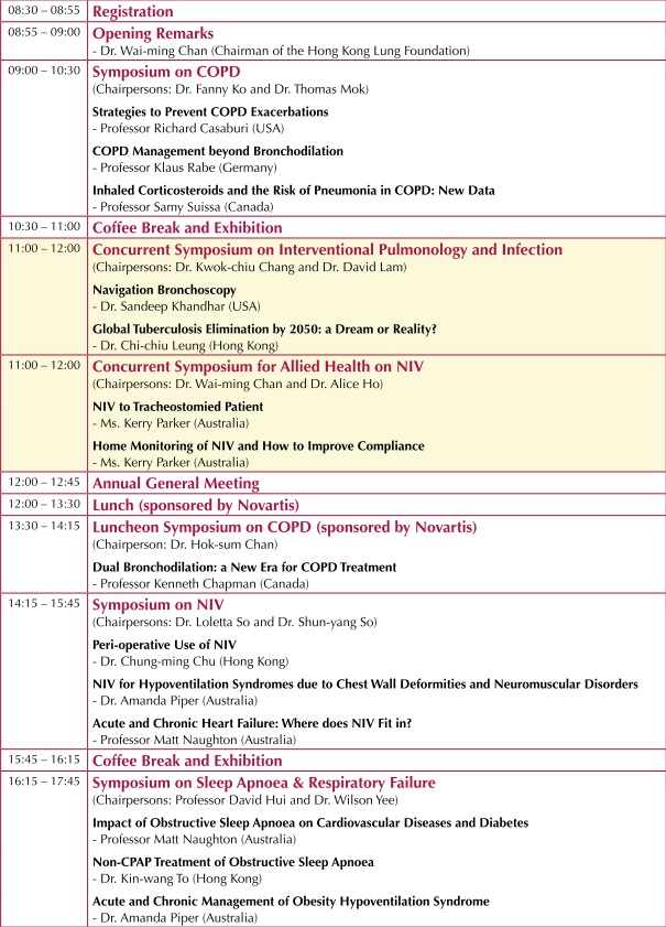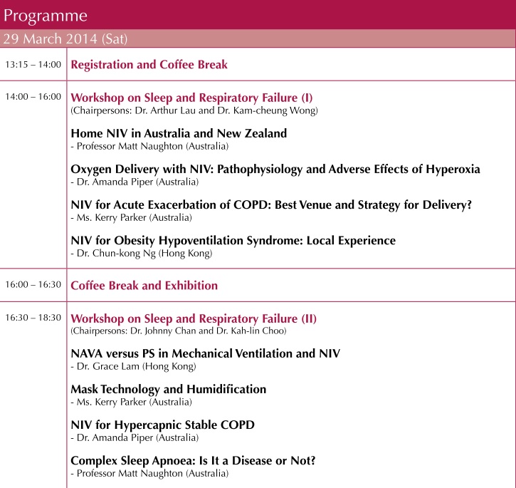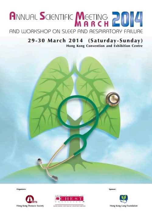 Please be informed that the Annual Scientific Meeting 2014 organised by the Hong Kong Thoracic Society and the American College of Chest Physicians (HK and Macau Chapter) with support from the Hong Kong Lung Foundation, will be held on 30 March (Sun) at the Hong Kong Convention and Exhibition Centre. This year, a Workshop on Sleep and Respiratory Failure will be held on 29 March (Sat), 1-day before the meeting.