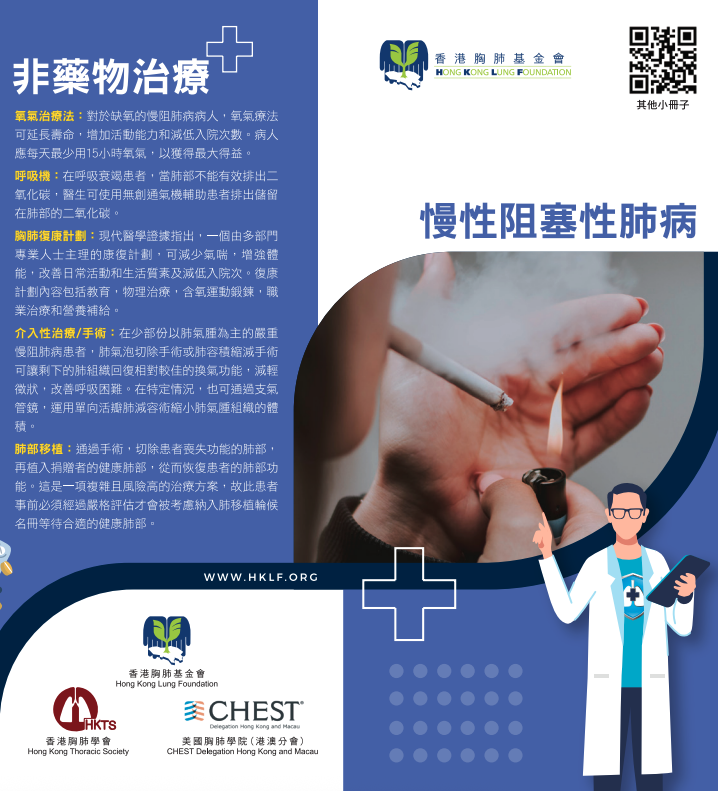 - 介入性治療/手術: 在少部份以肺氣腫為主的嚴重慢阻肺病患者, 肺氣泡切除手術或肺容積縮減手術可讓剩下的肺組織回復相對較佳的換氣功能, 減輕徵狀, 改善呼吸困難。在特定情況, 也可通過支氣管鏡, 運用單向活瓣肺減容術縮小肺氣腫組織的體積。肺部移植: 通過手術,切除患者喪失功能的肺部,再植入捐贈者的健康肺部,從而恢復患者的肺部功能。 這是一項複雜且風險高的治療方案, 故此患者事前必須經過嚴格評估才會被考慮納入肺移植輪候名冊等待合適的健康肺部。