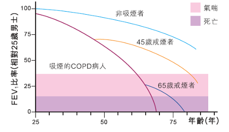 - 戒煙: 吸煙者死於慢阻肺病的可能性是不吸煙者的12至13倍! 所以慢阻肺病病人必須盡早戒煙, 以減少持續對肺部的傷害。戒煙後FEV1下降速度也減慢至與常人一樣,更可延遲氣喘的出現和惡化(見圖二) 。長期而言, 病者寶貴的生命也得延長了。現在戒煙的方法有很多, 請參考”戒煙的疑惑”單張作進一步行動。